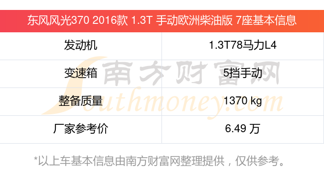 東風(fēng)風(fēng)光370 2016款 1.3T 手動(dòng)歐洲柴油版 7座動(dòng)力上搭載的是一臺(tái)1.3T78馬力L4渦輪增壓發(fā)動(dòng)機(jī),匹配5擋手動(dòng)擋變速箱,燃料形式為柴油,常規(guī)整備質(zhì)量1370kg,廠家參考價(jià)6.49萬(wàn)元。