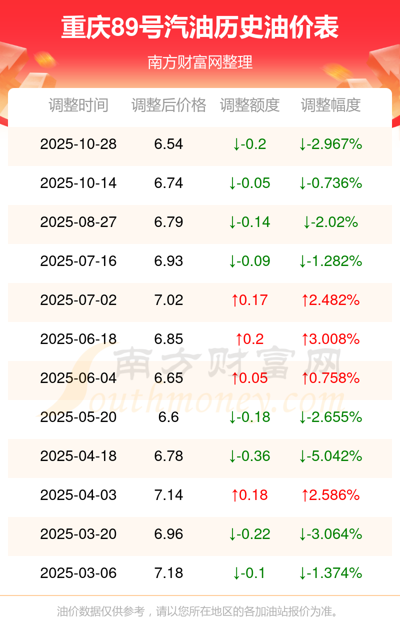 11月8日,重慶89號(hào)汽油的價(jià)格是6.54元每升,本次的調(diào)整時(shí)間為10月28日,對(duì)比上次的調(diào)整下調(diào)了0.2元,下調(diào)2.967%,11月10日24時(shí)為下一輪油價(jià)調(diào)整時(shí)間,還有2.46天。