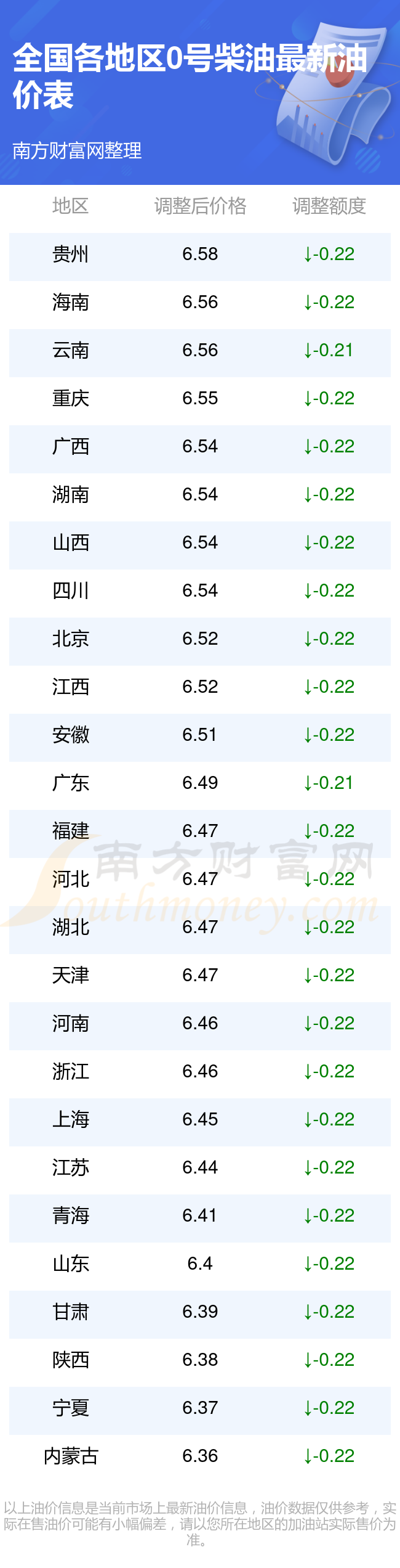 全國各地區(qū)0號柴油油價一覽表