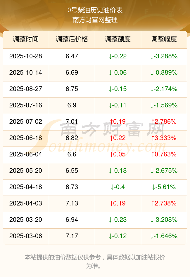 油價調(diào)整最新消息:下一輪油價調(diào)整時間11月10日24時。福建汽油、柴油11月8日每升最新價格查詢:本輪油價調(diào)整時間為10月28日,92號汽油6.81元,降了0.21元;95號汽油7.27元,降了0.23元;89號汽油6.34元,降了0.2;0號柴油6.47元,降了0.22元。
