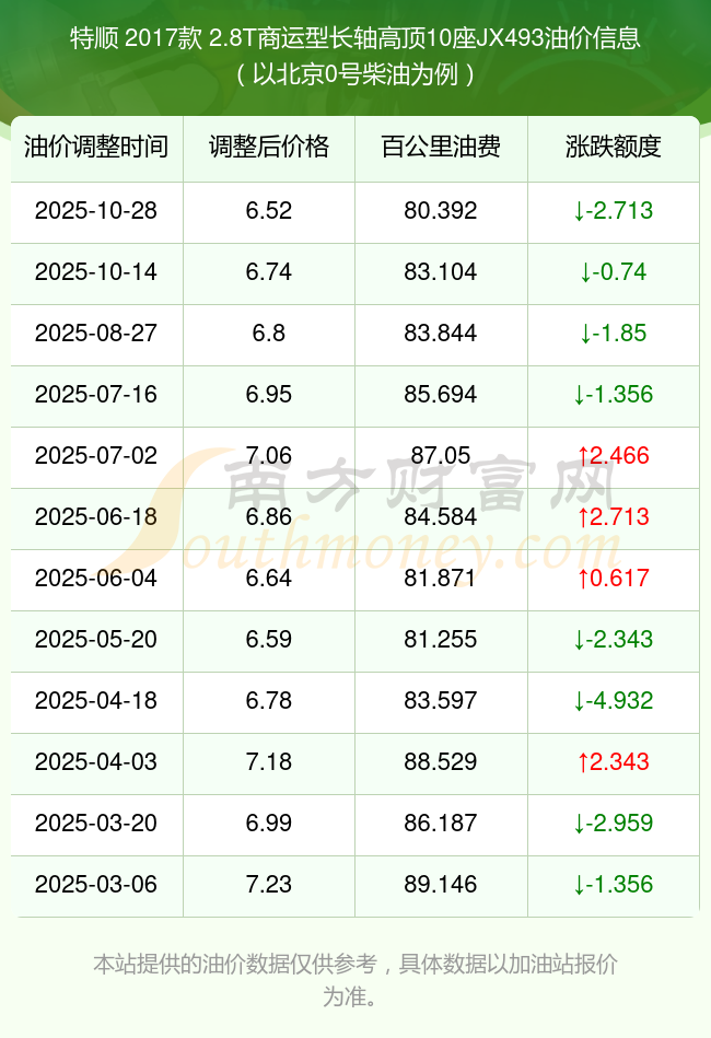 按照10月28日0號(hào)柴油最新調(diào)整價(jià)格6.52元/升來(lái)計(jì)算(以北京為例),該車型百公里平均油費(fèi)為80.392元,按照上一輪10月14日調(diào)整價(jià)格6.74元/升來(lái)計(jì)算,百公里平均油費(fèi)為83.104元,對(duì)比上一輪少花2.713元,下一輪油價(jià)調(diào)整時(shí)間為11月10日24時(shí)。