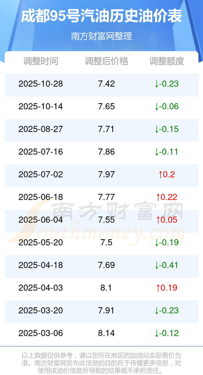 11月8日,成都95號汽油價格為每升7.42元,這是10月28日油價調(diào)整后的價格,相對上次調(diào)整時間10月14日的油價7.65元每升,下降了0.23元,下降3.007%。下一輪油價調(diào)整時間11月10日24時,距離現(xiàn)在還有2.43天。
