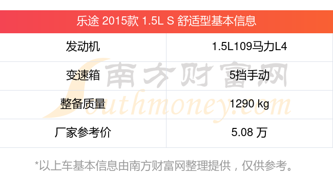 樂途 2015款 1.5L S 舒適型搭載了一臺1.5L109馬力L4自然吸氣發(fā)動機,采用5擋手動擋變速箱,常規(guī)整備質(zhì)量1290kg,廠家參考價5.08萬元。