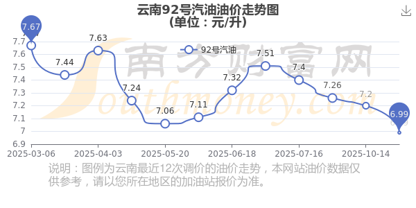 11月8日,云南92號汽油的價格是6.99元每升,本次的調整時間為10月28日,對比上次的調整減了0.21元,減2.917%,下次調整時間為11月10日24時,還有2.42天。