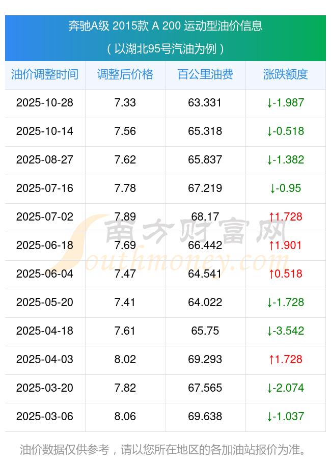按照10月28日95號汽油最新調(diào)整價格7.33元/升來計算(以湖北為例),該車型百公里平均油費為63.331元,按照上一輪10月14日調(diào)整價格7.56元/升來計算,百公里平均油費為65.318元,對比上一輪少花1.987元,下一輪油價調(diào)整時間為11月10日24時。