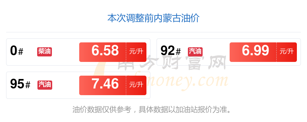 以上數(shù)據(jù)僅供參考,請以您所在地區(qū)的加油站實(shí)際售價為準(zhǔn)。南方財富網(wǎng)發(fā)布此信息的目的在于傳播更多信息,對使用該油價信息所導(dǎo)致的結(jié)果概不承擔(dān)責(zé)任。