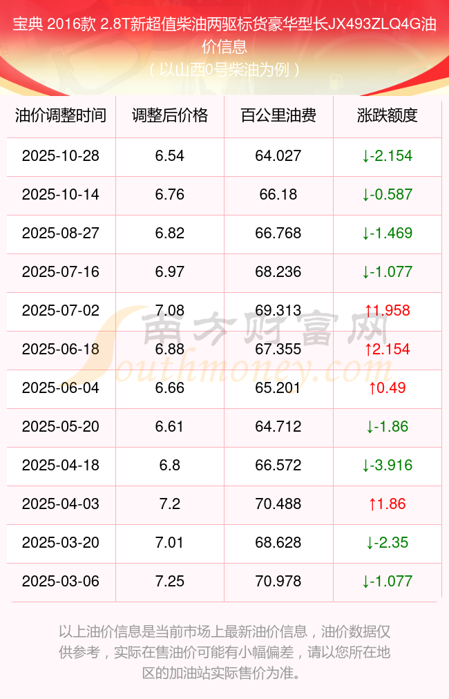 該車型目前采用的是2.8T109馬力L4渦輪增壓發(fā)動機,5擋手動擋的變速箱,按0號柴油當前最新價格6.54元/升來計算(以山西為例),平均油費為0.640266元每公里。廠家參考價為8.28萬元。