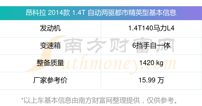 昂科拉 2014款 1.4T 自動兩驅(qū)都市精英型動力上配備的是一臺1.4T140馬力L4渦輪增壓發(fā)動機,匹配的是6擋手自一體自動檔變速箱,燃料形式為汽油,常規(guī)整備質(zhì)量1420kg,廠家參考價15.99萬元。