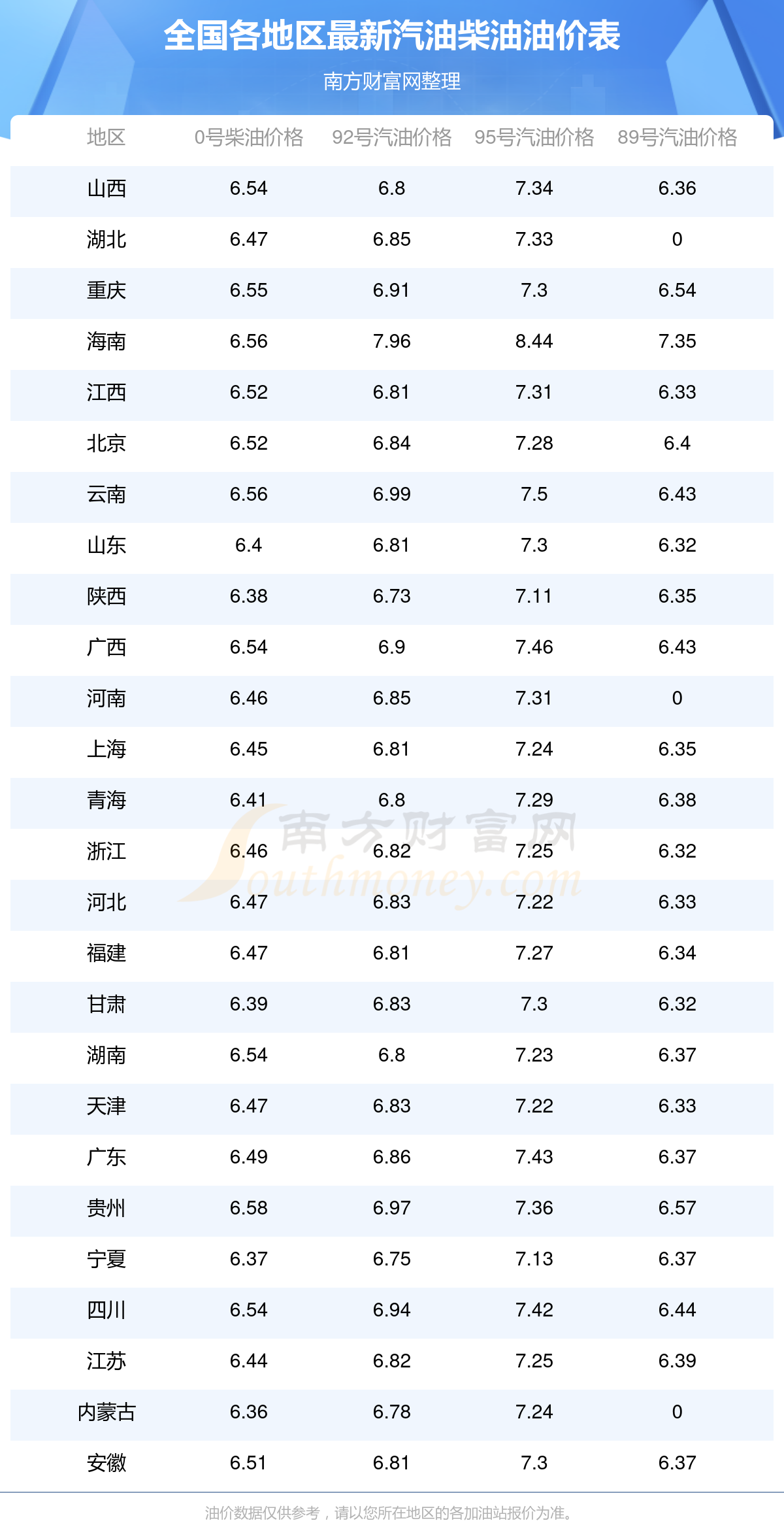 全國89號汽油最新平均價格為:6元每升,其中,最高為海南,價格為7.35元/升,最低為浙江,價格為6.32元/升。