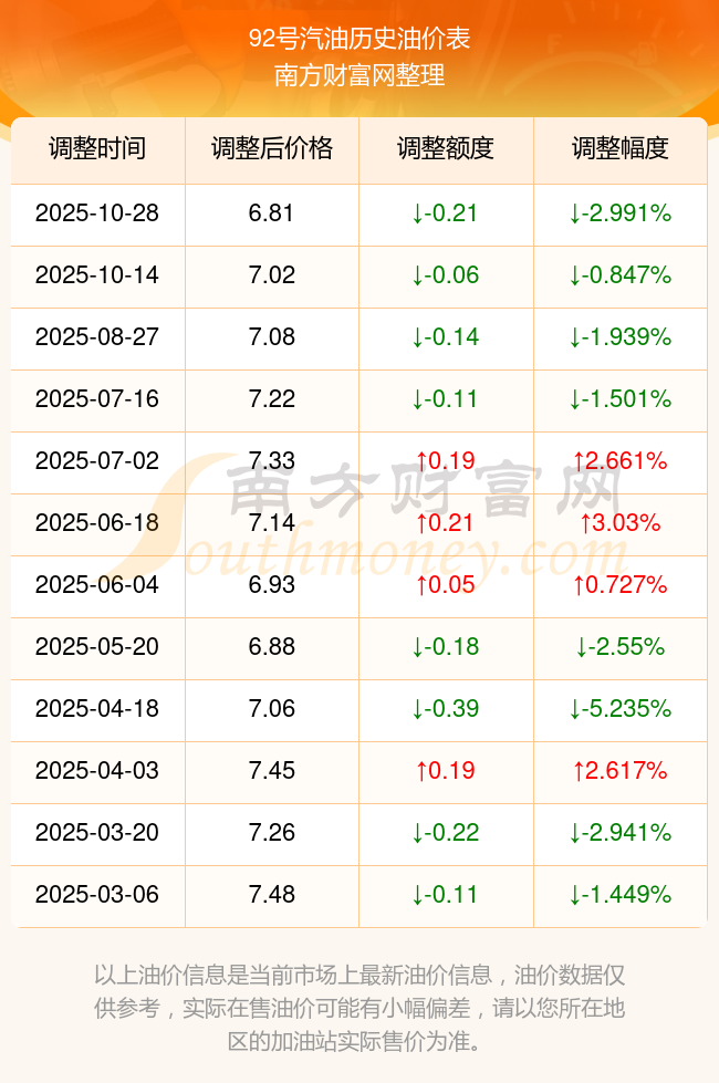 以上數(shù)據(jù)僅供參考,請以您所在地區(qū)的加油站實際售價為準。南方財富網(wǎng)發(fā)布此信息的目的在于傳播更多信息,對使用該油價信息所導致的結(jié)果概不承擔責任。