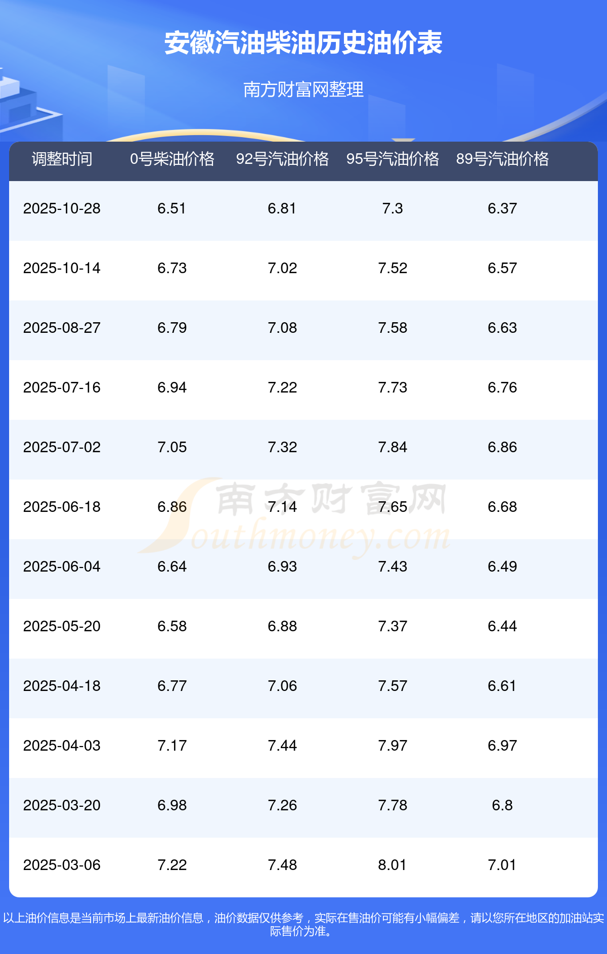 11月8日,安徽95號(hào)汽油的價(jià)格是7.3元每升,本次的調(diào)整時(shí)間為10月28日,對(duì)比上次的調(diào)整下降了0.22元,下降2.926%,下次調(diào)整時(shí)間為11月10日24時(shí),還有2.4天。