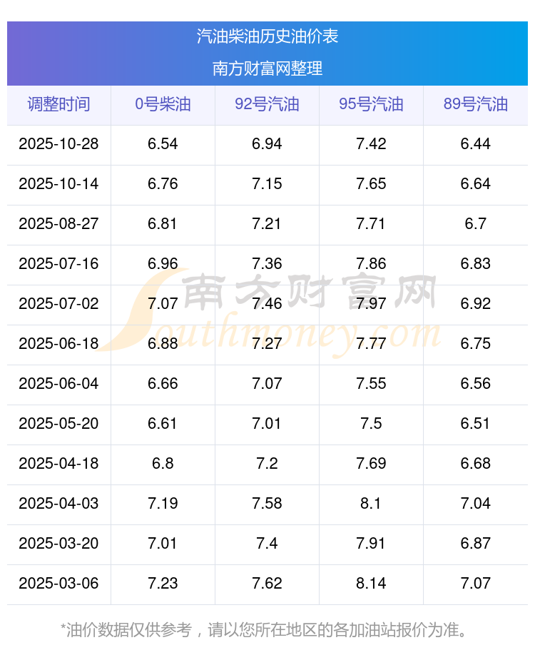 2025年汽油柴油油價調整一覽表