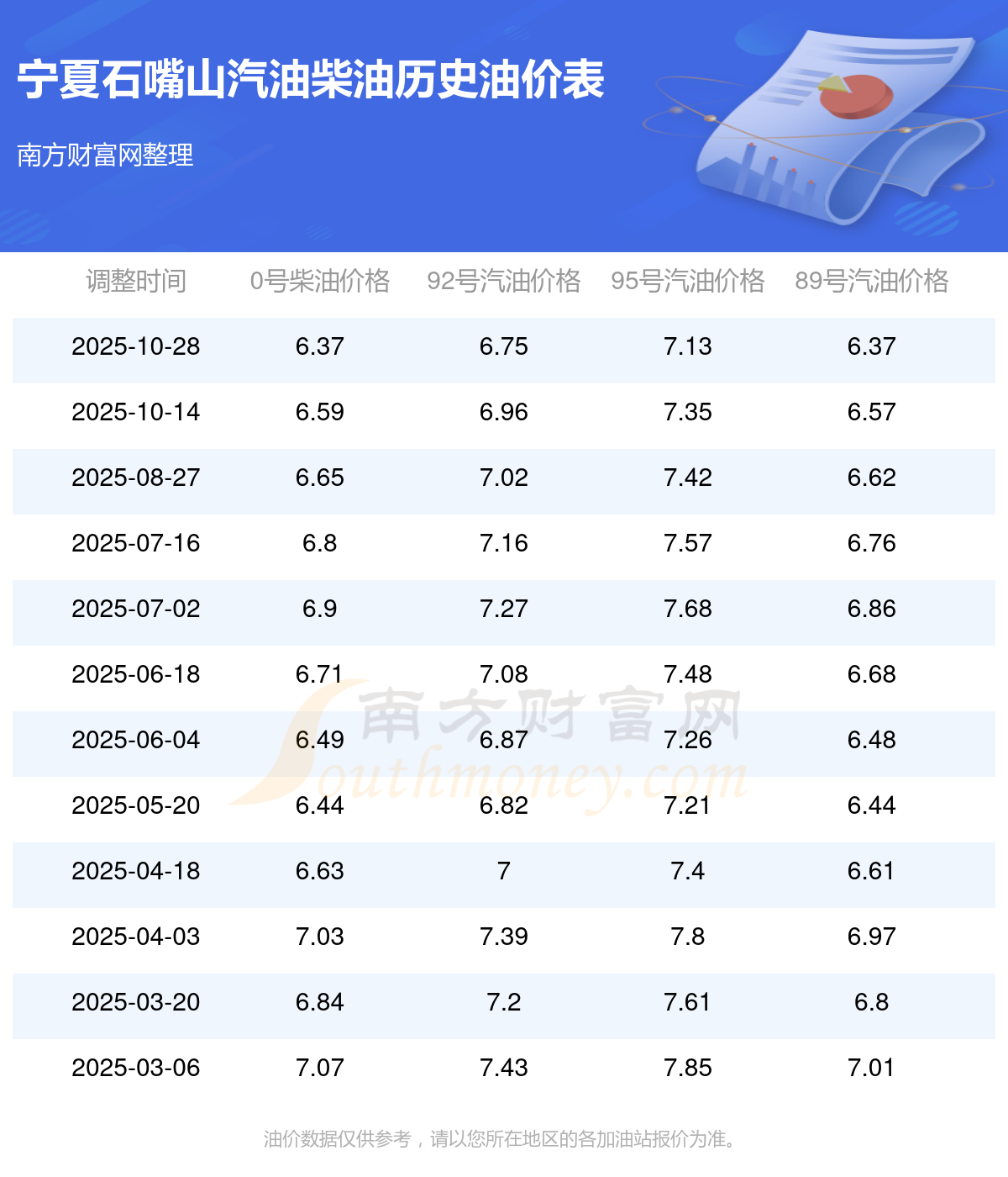 11月8日寧夏石嘴山汽油、柴油的價格是10月28日調(diào)整后的價格,每升價格為:92號汽油為6.75元,減了0.21元,減幅達3.02%;95號汽油為7.13元,減了0.22元,減幅達2.99%;89號汽油為6.37元,減了0.2元,減幅達3.04%;0號柴油為6.37元,減了0.22元,減幅達3.34%。