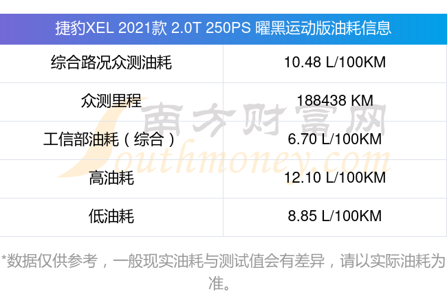 根據(jù)車主實(shí)測(cè)數(shù)據(jù),該車型低油耗為8.85升每百公里,高油耗為12.10升每百公里,綜合路況眾測(cè)油耗為10.48升每百公里,工信部綜合油耗為6.70升每百公里。