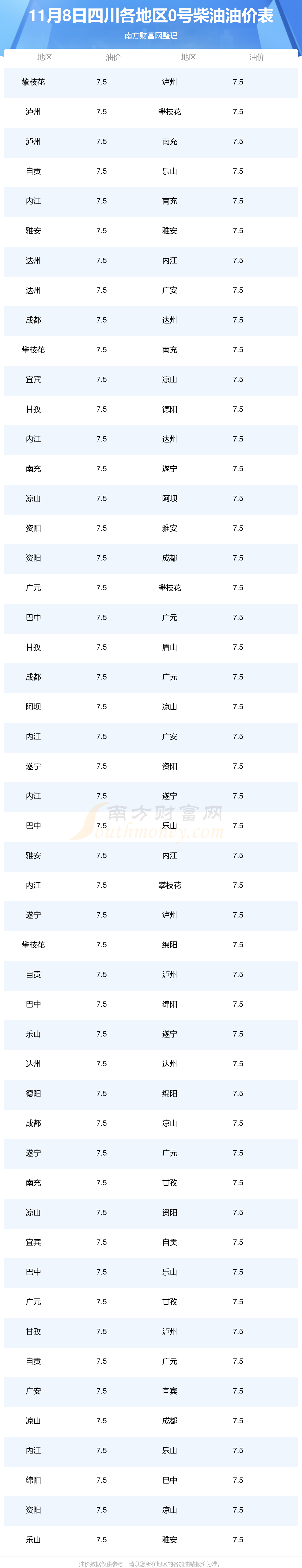 11月8日,四川0號柴油的價格是6.54元每升,本次的調整時間為10月28日,對比上次的調整下跌了0.22元,下跌3.254%,11月10日24時為下一輪油價調整時間,還有2.38天。