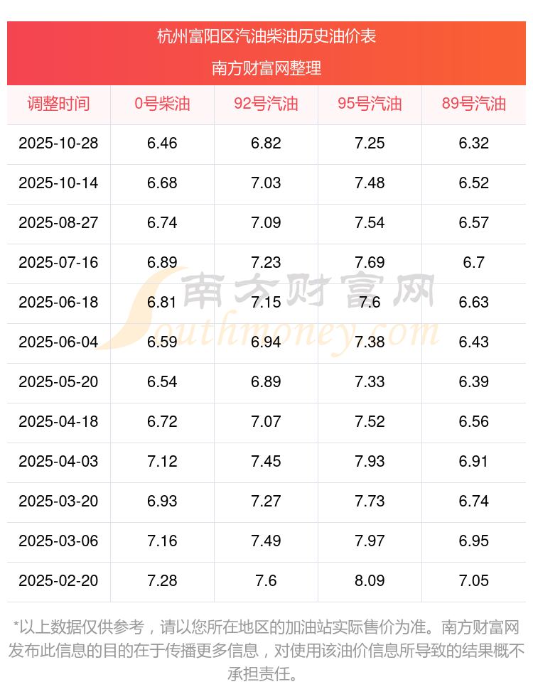 11月8日杭州富陽區(qū)0號(hào)柴油歷史油價(jià)一覽表