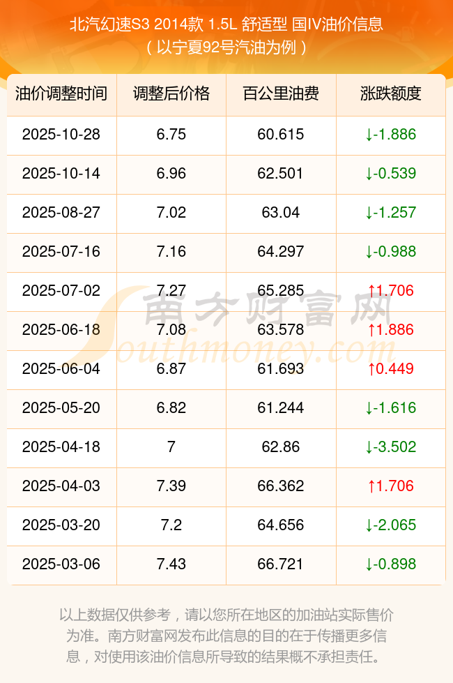依照10月28日92號汽油最新調(diào)整價格6.75元/升來計算(以寧夏為例),該車型百公里的平均油費是60.615元,依照上一輪10月14日調(diào)整價格6.96元/升來計算,百公里的平均油費是62.501元,對比上一輪少花1.886元,下一輪的油價調(diào)整時間11月10日24時。