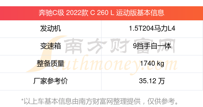 在動(dòng)力方面,奔馳C級(jí) 2022款 C 260 L 運(yùn)動(dòng)版搭載的是一臺(tái)1.5T204馬力L4渦輪增壓發(fā)動(dòng)機(jī),匹配9擋手自一體自動(dòng)檔變速箱,燃料形式為汽油+48V輕混系統(tǒng),常規(guī)整備質(zhì)量1740kg,廠家參考價(jià)35.12萬(wàn)元。