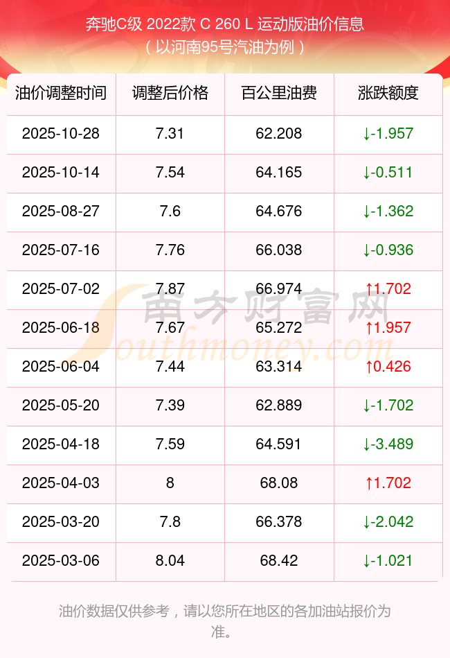 按照10月28日95號(hào)汽油最新調(diào)整價(jià)格7.31元/升來(lái)計(jì)算(以河南為例),該車(chē)型百公里平均油費(fèi)為62.208元,按照上一輪10月14日調(diào)整價(jià)格7.54元/升來(lái)計(jì)算,百公里平均油費(fèi)為64.165元,對(duì)比上一輪少花1.957元,下一輪油價(jià)調(diào)整時(shí)間為11月10日24時(shí)。