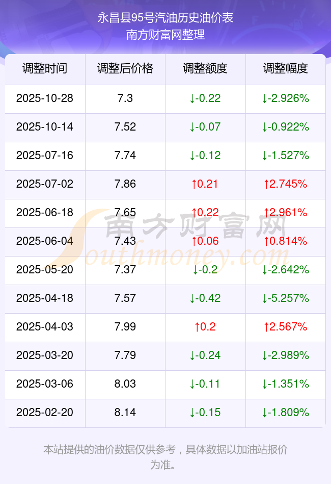 11月8日永昌縣95號(hào)汽油歷史油價(jià)一覽表