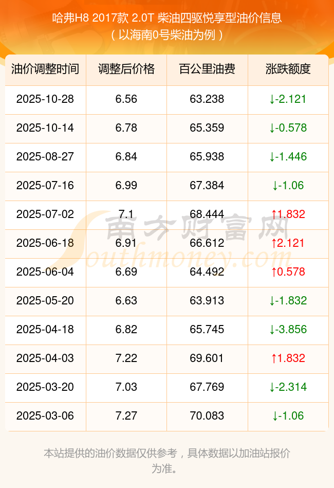 依照10月28日0號柴油最新調(diào)整價格6.56元/升來計算(以海南為例),該車型百公里的平均油費是63.238元,依照上一輪10月14日調(diào)整價格6.78元/升來計算,百公里的平均油費是65.359元,對比上一輪少花2.121元,下一輪的油價調(diào)整時間11月10日24時。