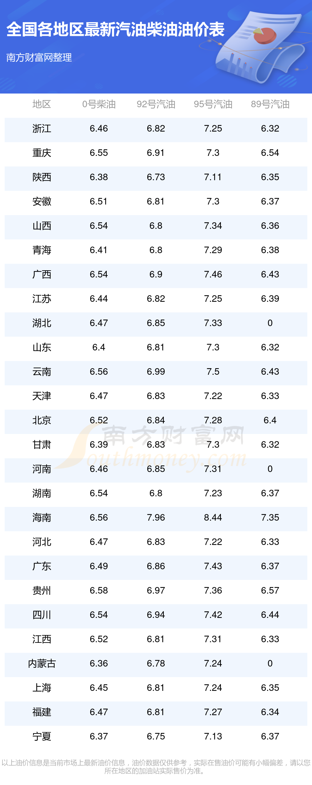 油價(jià)數(shù)據(jù)僅供參考,請(qǐng)以您所在地區(qū)的加油站報(bào)價(jià)為準(zhǔn)。南方財(cái)富網(wǎng)發(fā)布此信息的目的在于傳播更多信息,對(duì)使用該油價(jià)信息所導(dǎo)致的結(jié)果概不承擔(dān)任何責(zé)任。