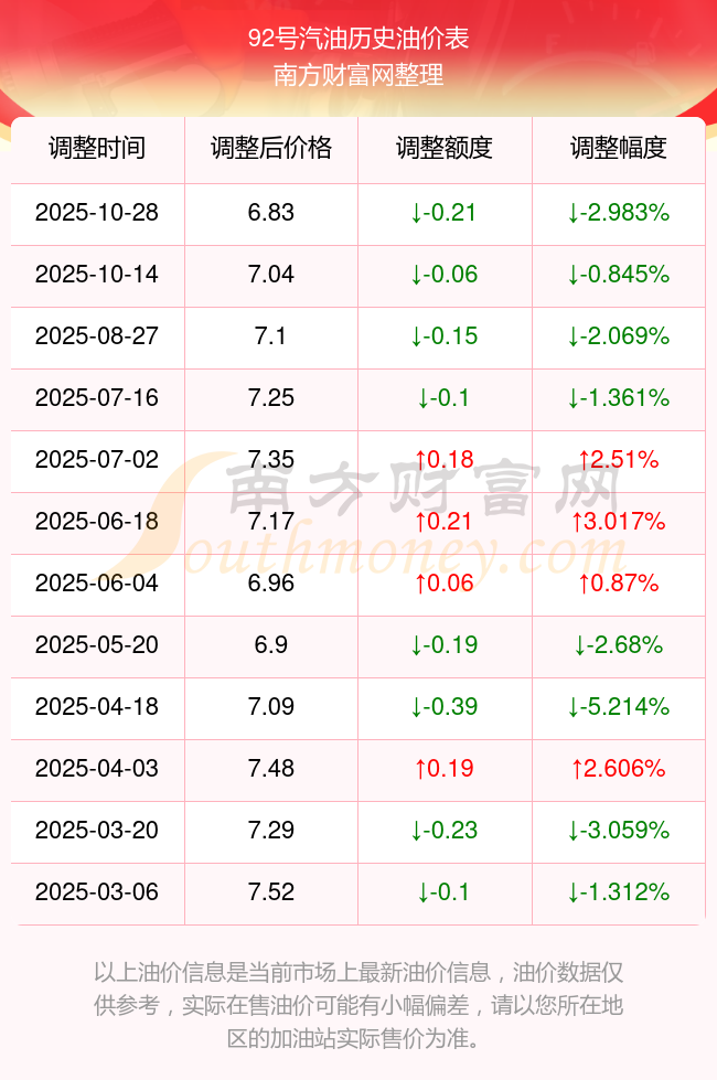 油價數(shù)據(jù)僅供參考,請以您所在地區(qū)的加油站報價為準。南方財富網(wǎng)發(fā)布此信息的目的在于傳播更多信息,對使用該油價信息所導(dǎo)致的結(jié)果概不承擔任何責任。