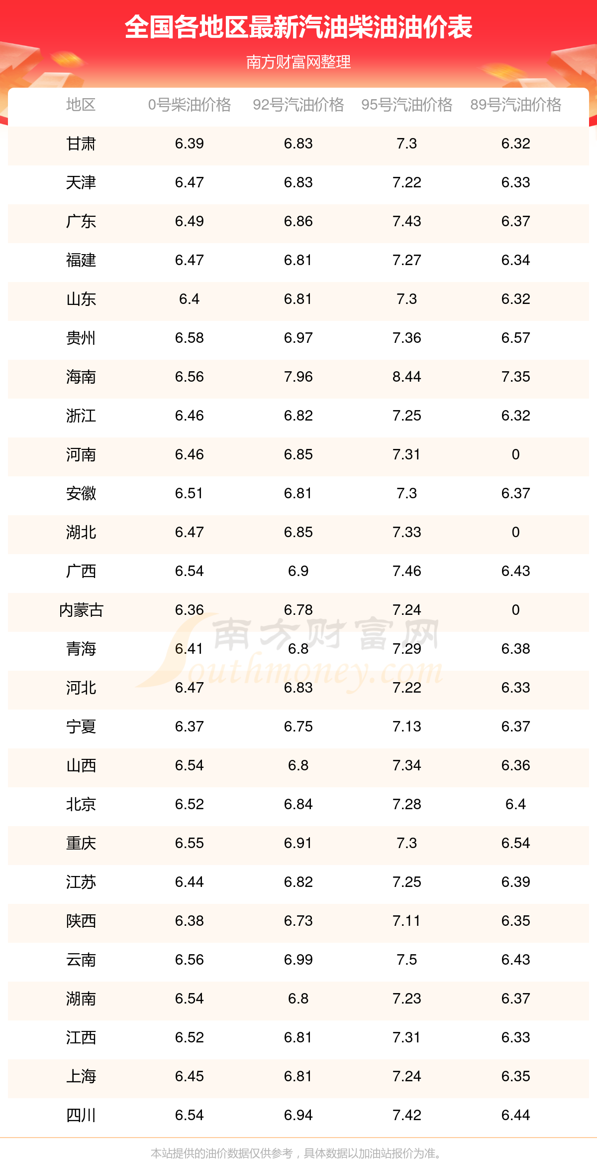 全國各地區(qū)2025年最新汽油價(jià)格表