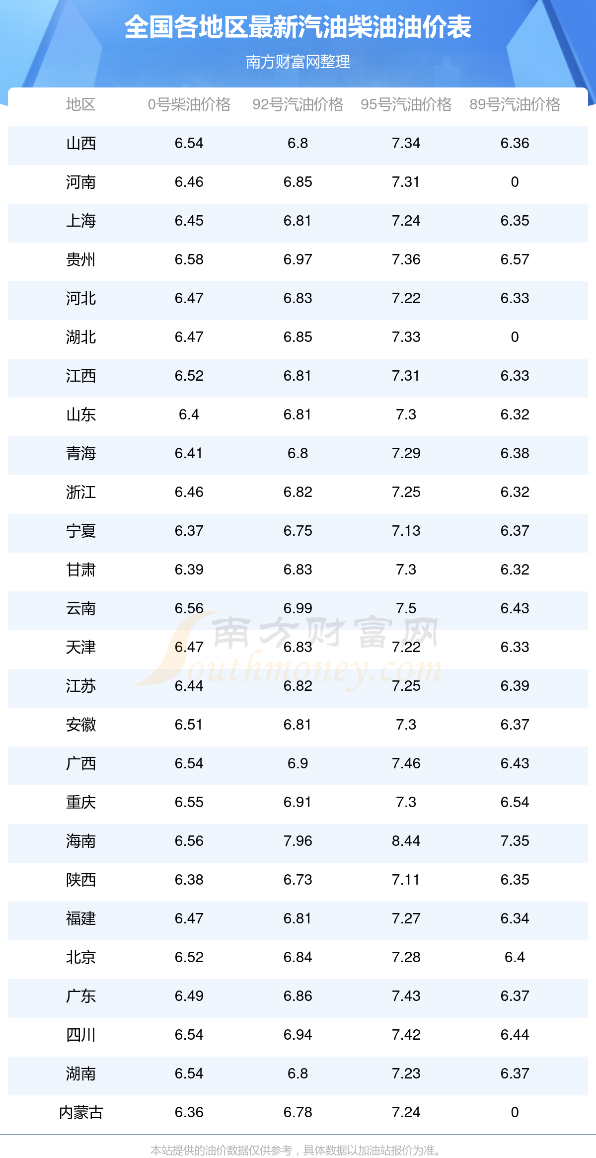 2025年全國各地區(qū)最新油價表