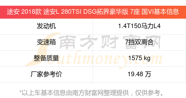 途安 2018款 途安L 280TSI DSG拓界豪華版 7座 國(guó)VI動(dòng)力上配備的是一臺(tái)1.4T150馬力L4渦輪增壓發(fā)動(dòng)機(jī),匹配的是7擋雙離合自動(dòng)檔變速箱,燃料形式為汽油,常規(guī)整備質(zhì)量1575kg,廠家參考價(jià)19.48萬(wàn)元。