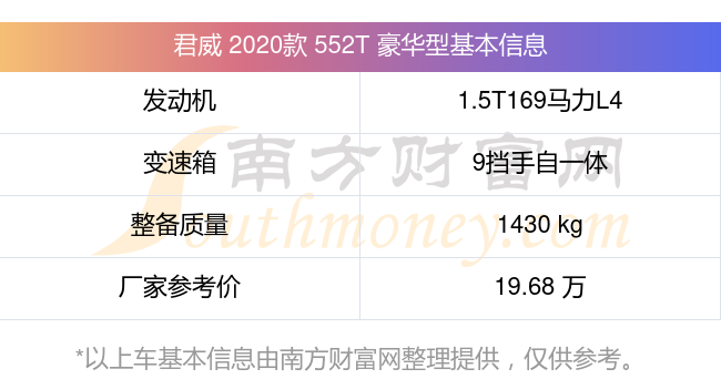 君威 2020款 552T 豪華型動力方面,搭載的是一臺1.5T169馬力L4渦輪增壓發(fā)動機,匹配9擋手自一體自動檔變速箱,燃料形式為汽油,常規(guī)整備質(zhì)量1430kg,廠家參考價19.68萬元。