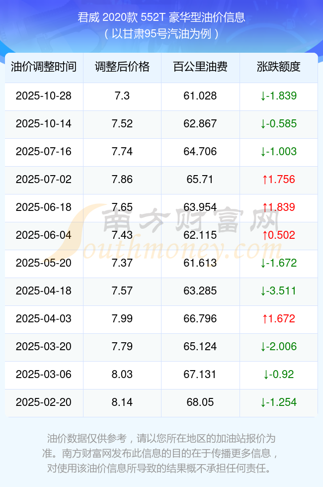 依照10月28日95號汽油最新調(diào)整價格7.3元/升來計算(以甘肅為例),該車型百公里的平均油費是61.028元,依照上一輪10月14日調(diào)整價格7.52元/升來計算,百公里的平均油費是62.867元,對比上一輪少花1.839元,下一輪的油價調(diào)整時間11月10日24時。