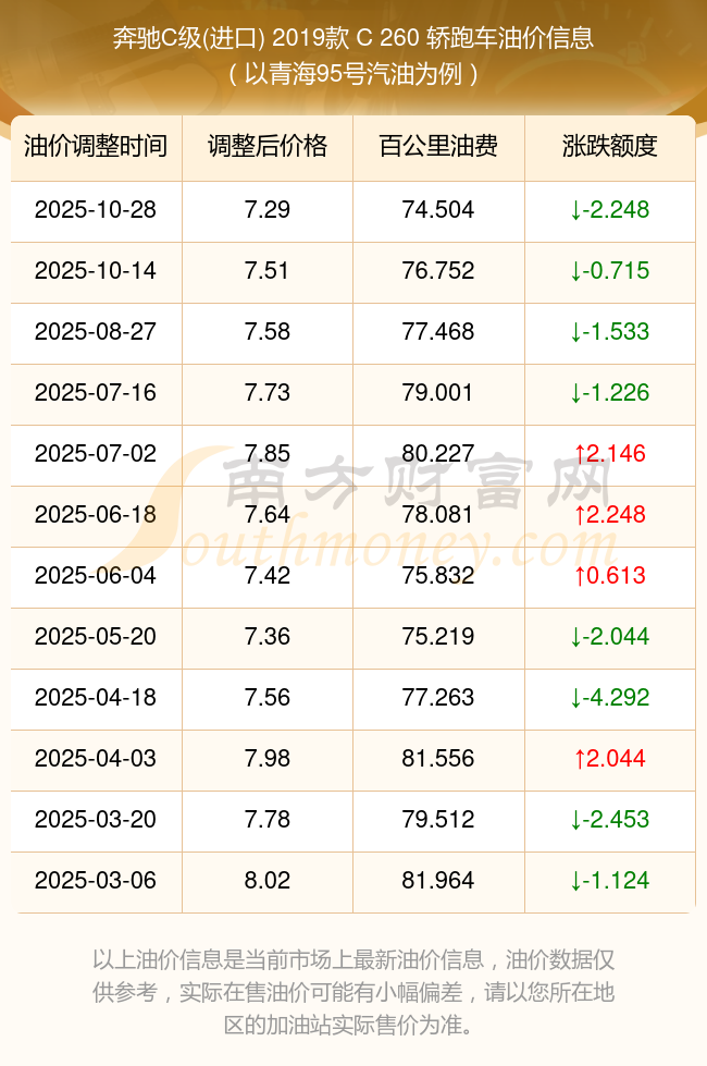 按照10月28日95號(hào)汽油最新調(diào)整價(jià)格7.29元/升來(lái)計(jì)算(以青海為例),該車型百公里平均油費(fèi)為74.504元,按照上一輪10月14日調(diào)整價(jià)格7.51元/升來(lái)計(jì)算,百公里平均油費(fèi)為76.752元,對(duì)比上一輪少花2.248元,下一輪油價(jià)調(diào)整時(shí)間為11月10日24時(shí)。