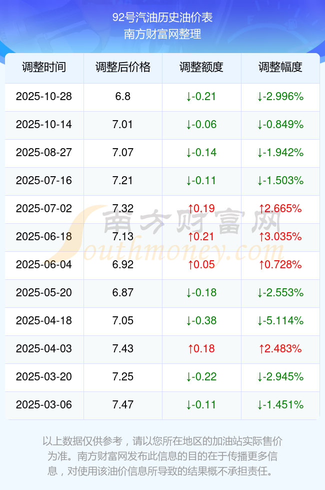 以上數(shù)據(jù)僅供參考,請以您所在地區(qū)的加油站實際售價為準。南方財富網(wǎng)發(fā)布此信息的目的在于傳播更多信息,對使用該油價信息所導致的結果概不承擔責任。