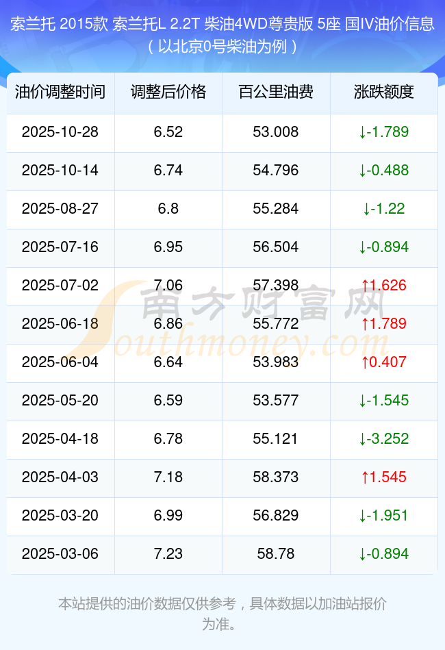 依照10月28日0號柴油最新調(diào)整價格6.52元/升來計算(以北京為例),該車型百公里的平均油費是53.008元,依照上一輪10月14日調(diào)整價格6.74元/升來計算,百公里的平均油費是54.796元,對比上一輪少花1.789元,下一輪的油價調(diào)整時間11月10日24時。