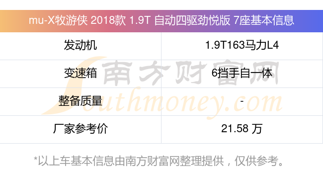 mu-X牧游俠 2018款 1.9T 自動(dòng)四驅(qū)勁悅版 7座動(dòng)力方面,搭載的是一臺(tái)1.9T163馬力L4渦輪增壓發(fā)動(dòng)機(jī),匹配6擋手自一體自動(dòng)檔變速箱,燃料形式為柴油,廠家參考價(jià)21.58萬(wàn)元。