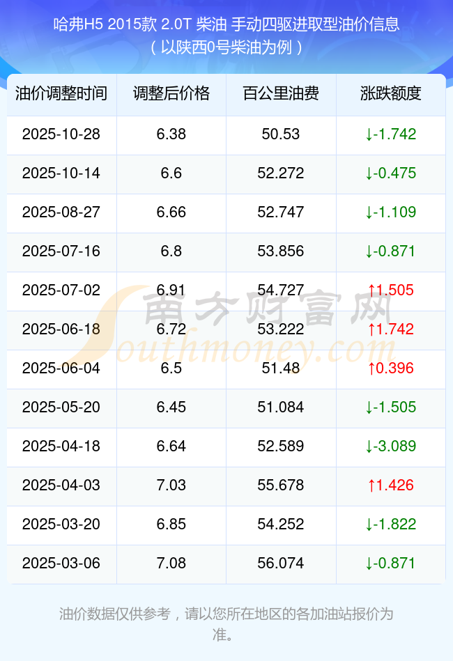 根據(jù)10月28日0號(hào)柴油最新調(diào)整價(jià)格6.38元/升來(lái)計(jì)算(以陜西為例),該車(chē)型每百公里的平均油費(fèi)是50.53元,上一輪10月14日調(diào)整價(jià)格6.6元每升來(lái)計(jì)算,每百公里的平均油費(fèi)是52.272元,對(duì)比上一輪少花1.742元,下一輪的油價(jià)調(diào)整時(shí)間是11月10日24時(shí)。