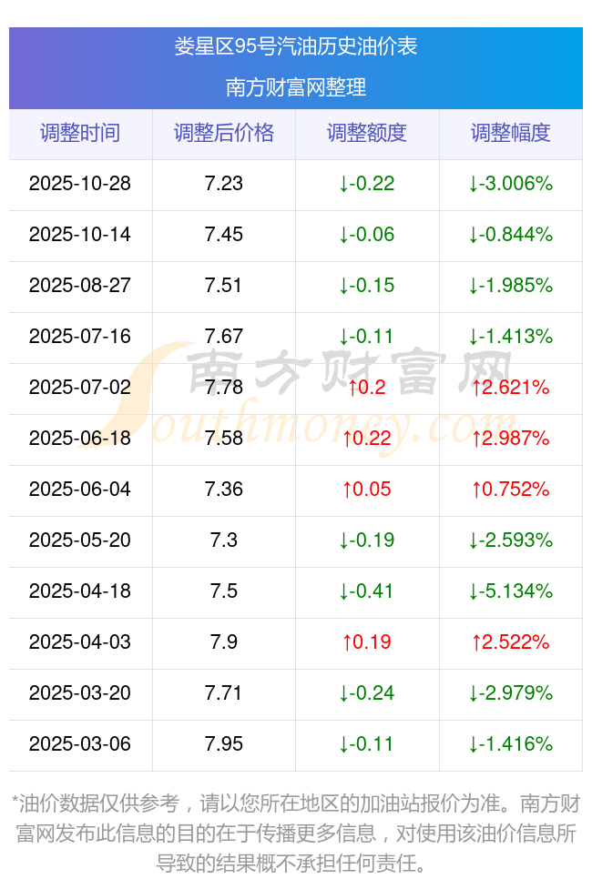 11月8日婁星區(qū)95號(hào)汽油歷史油價(jià)一覽表