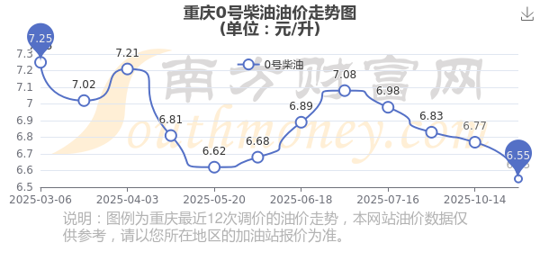 重慶0號(hào)柴油11月8日價(jià)格為6.55元/升,調(diào)整時(shí)間為10月28日,相對(duì)上次調(diào)整時(shí)間10月14日的油價(jià)6.77元/升,減了0.22元。