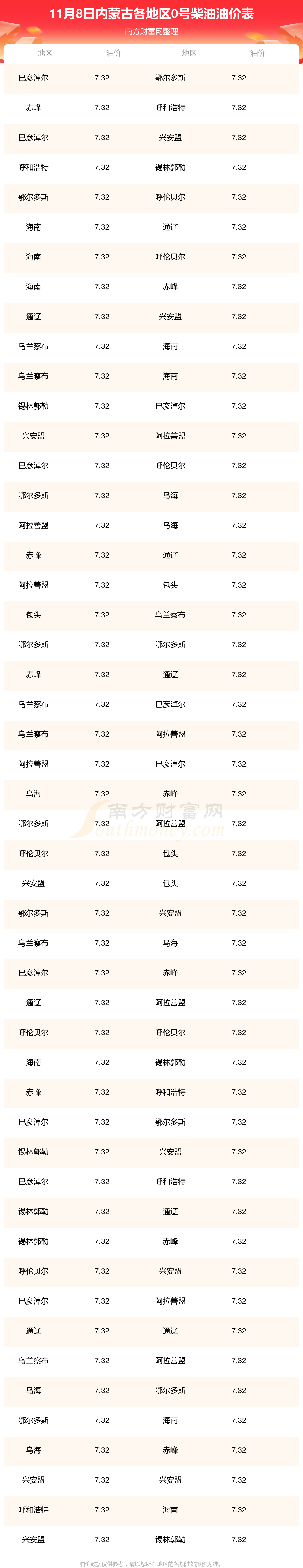 2025年11月8日內(nèi)蒙古0號柴油最新價(jià)格一覽表