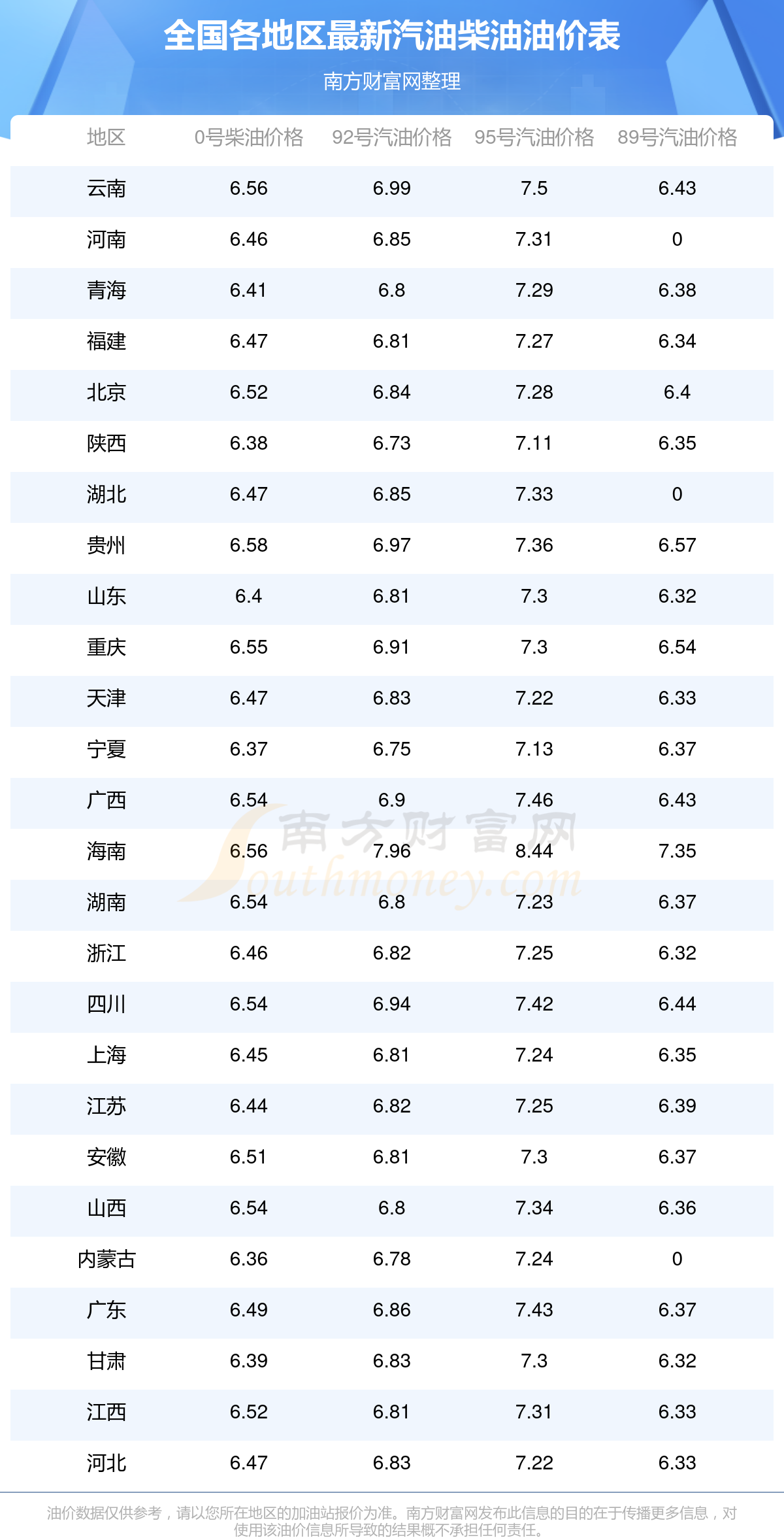 本次油價的調整時間為10月28日,調整后全國油價詳情為:92號汽油平均價格為7元每升,其中,最低的是陜西,6.73元每升,最高的是海南,7.96元每升。95號汽油平均價格為7元每升,其中,最低的是陜西,7.11元每升,最高的是海南,8.44元每升。0號柴油平均價格為:6元每升,其中,最低的是內蒙古,6.36元每升,最高的是貴州,6.58元每升。89號汽油平均價格為6元每升,其中,最低的是浙江,6.32元每升,最高的是海南,7.35元每升。,下一輪油價調整時間11月10日24時,距離現(xiàn)在還有2.24天。