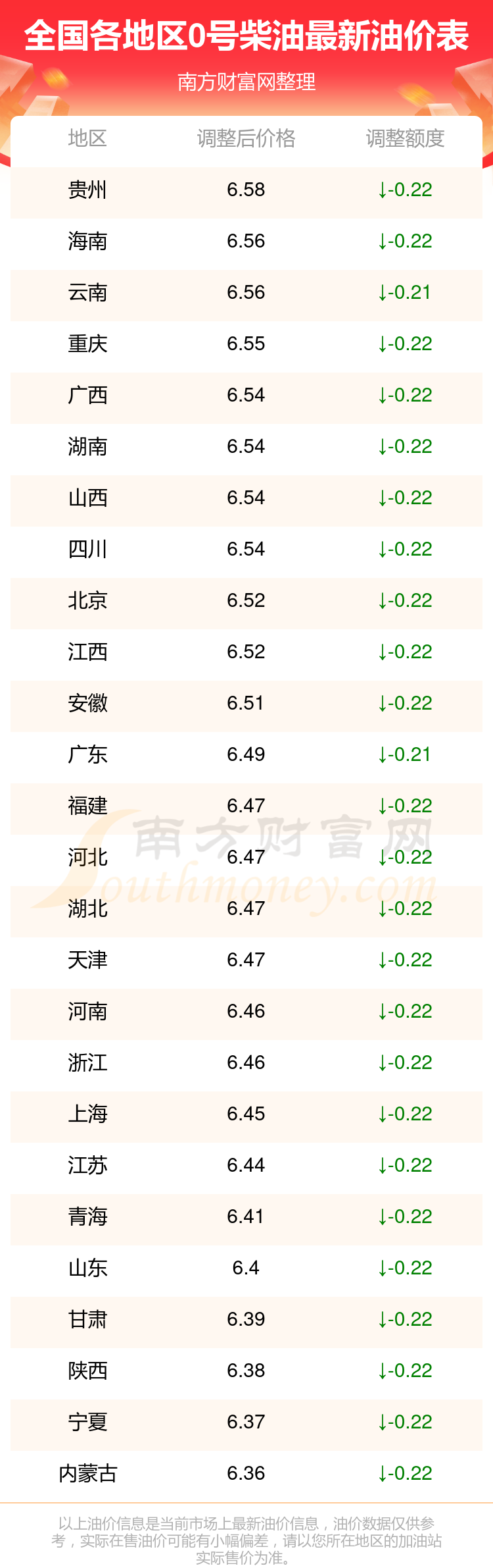 全國(guó)各地區(qū)0號(hào)柴油油價(jià)一覽表