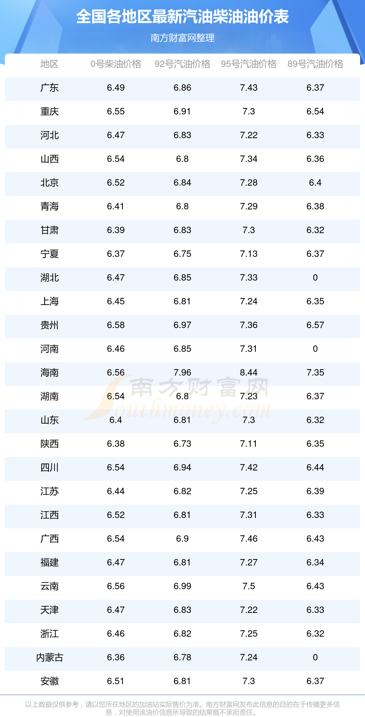 2025年11月8日全國各地油價調(diào)整及最新汽油價格表