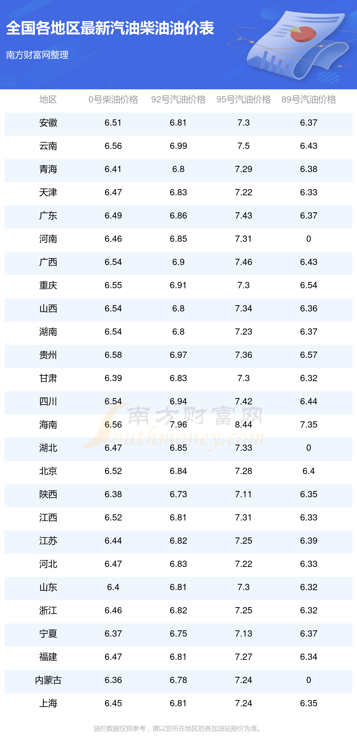 2025年11月8日全國油價調(diào)整及最新汽油價格表