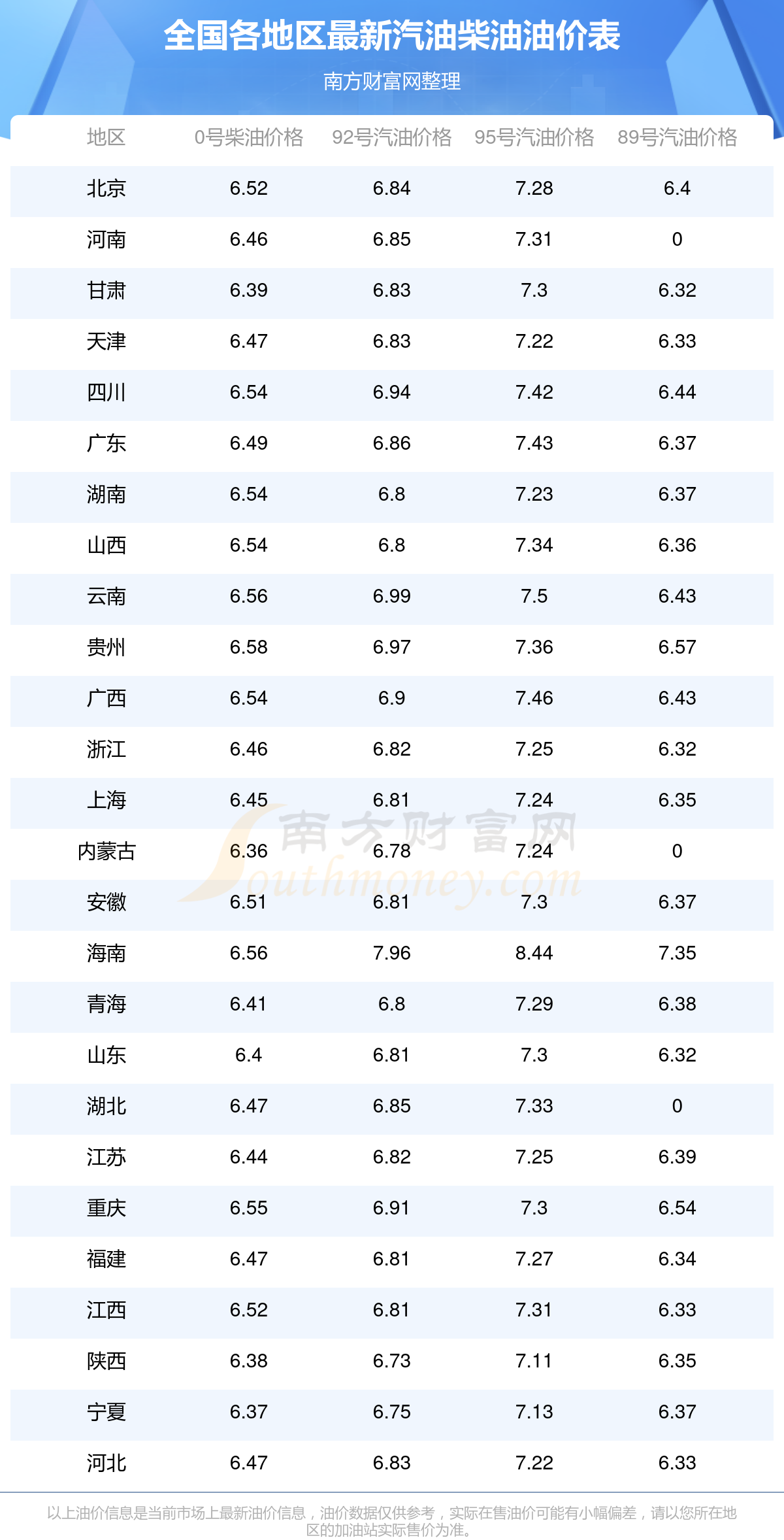 以上油價信息是當(dāng)前市場上最新油價信息,油價數(shù)據(jù)僅供參考,實際在售油價可能有小幅偏差,請以您所在地區(qū)的加油站實際售價為準(zhǔn)。