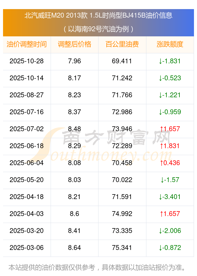 按10月28日92號汽油最新調(diào)整價格7.96元每升來計算(以海南為例),該車型百公里平均油費為69.411元,按上一輪10月14日調(diào)整價格8.17元每升來計算,百公里平均油費為71.242元,對比上一輪少花1.831元,下一輪油價調(diào)整時間為11月10日24時。