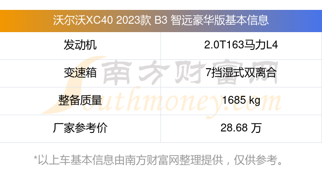 沃爾沃XC40 2023款 B3 智遠(yuǎn)豪華版搭載了一臺2.0T163馬力L4渦輪增壓發(fā)動機(jī),采用7擋濕式雙離合自動檔變速箱,常規(guī)整備質(zhì)量1685kg,廠家參考價(jià)28.68萬元。