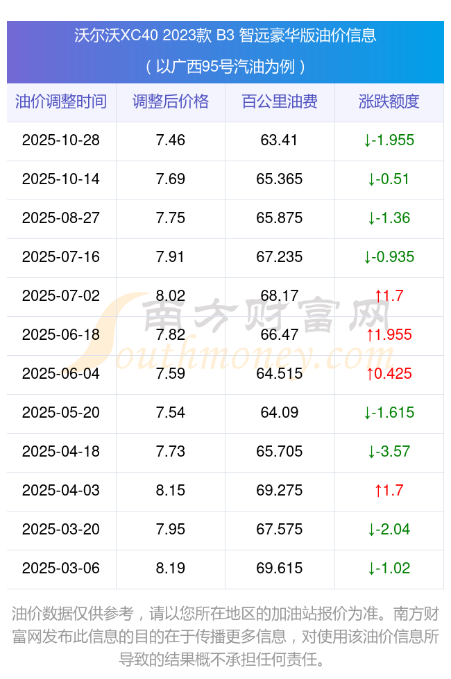 根據(jù)10月28日95號汽油最新調(diào)整價(jià)格7.46元/升來計(jì)算(以廣西為例),該車型每百公里的平均油費(fèi)是63.41元,上一輪10月14日調(diào)整價(jià)格7.69元每升來計(jì)算,每百公里的平均油費(fèi)是65.365元,對比上一輪少花1.955元,下一輪的油價(jià)調(diào)整時(shí)間是11月10日24時(shí)。