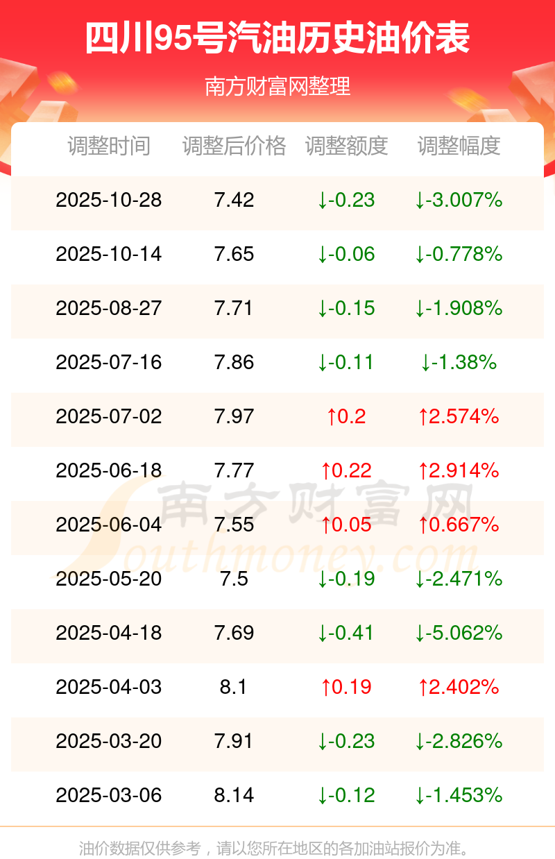 11月8日,四川95號汽油的價(jià)格是7.42元每升,本次的調(diào)整時(shí)間為10月28日,對比上次的調(diào)整減了0.23元,減3.007%,下次調(diào)整時(shí)間為11月10日24時(shí),還有2.18天。