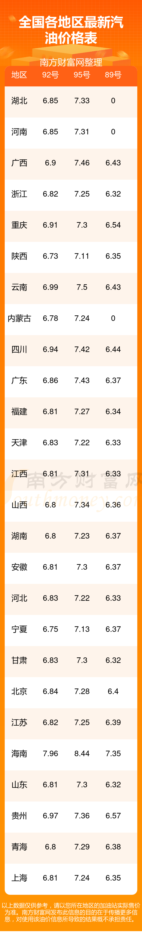 2025年11月8日全國(guó)各地汽油價(jià)格一覽表